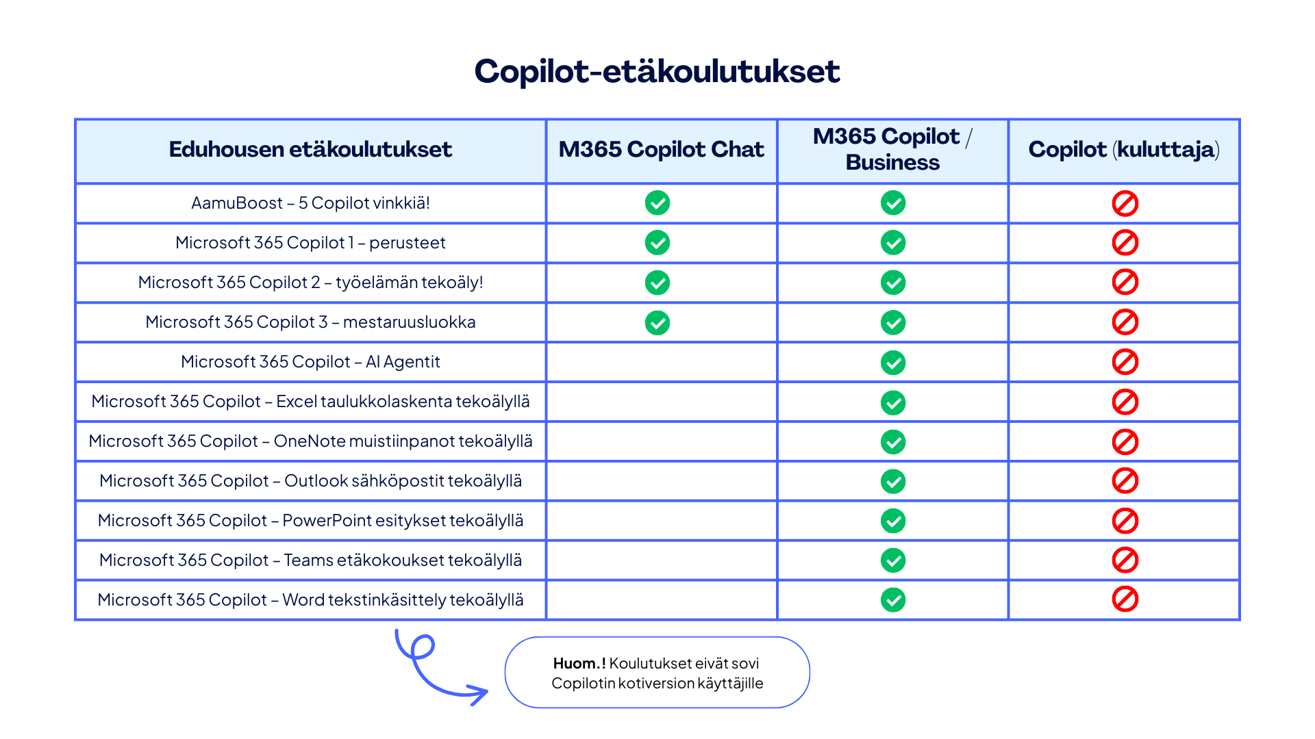 Tarjoamme koulutuksia sekä maksuttomilla että maksullisilla versioilla, jotta voit valita juuri sinulle ja tiimillesi sopivan vaihtoehdon. Kuvassa näet selkeästi, mitkä koulutukset ovat saatavilla maksuttomina ja mitkä vaativat lisenssin. Näin voit helposti suunnitella oppimispolkusi ja valita juuri ne työkalut, jotka parhaiten tukevat tarpeitasi.